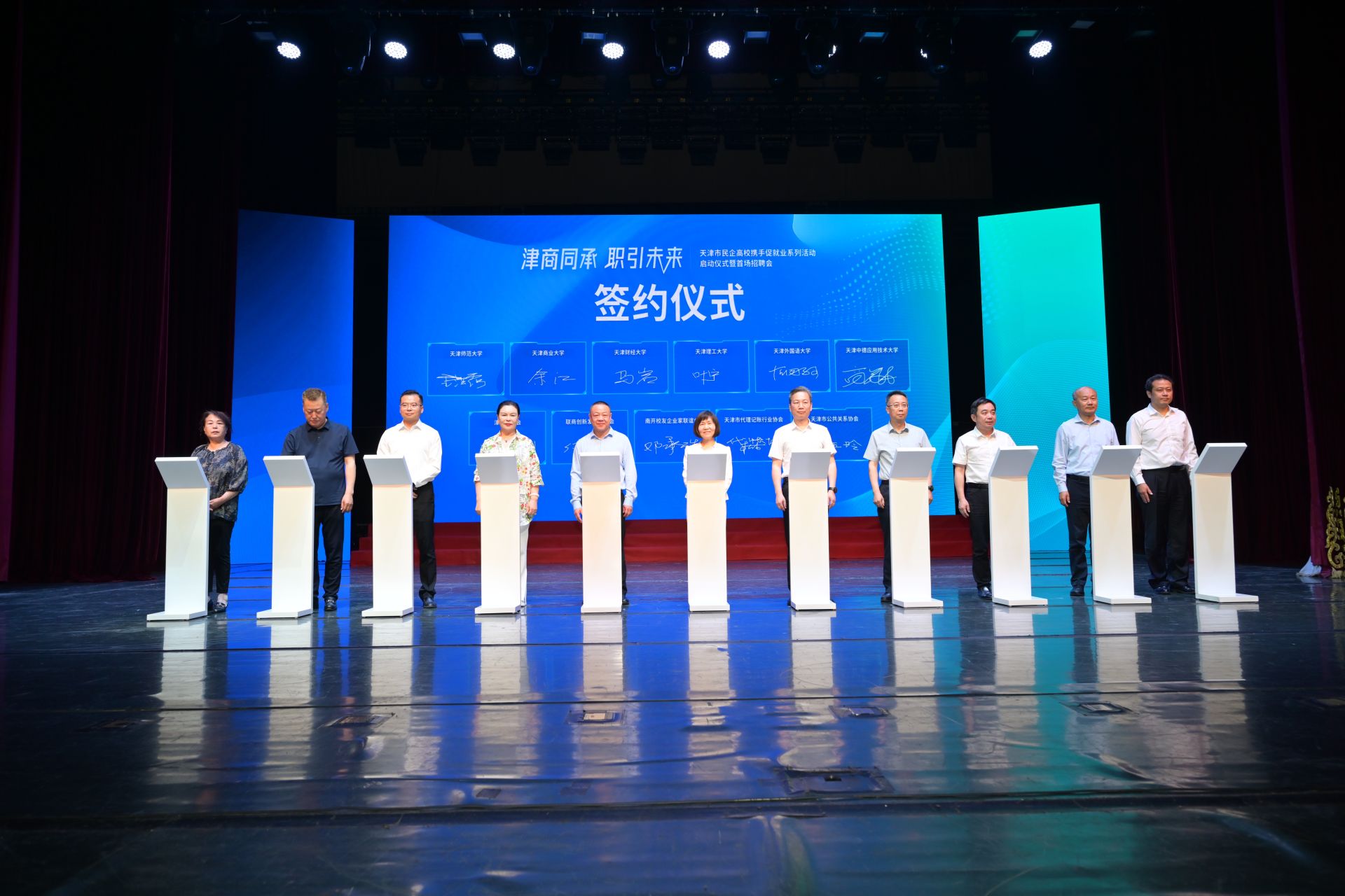 5月27日,由市委统战部指导,市工商联、市教委、市人社局、河西区人民政府主办,津商联合会等多家单位共同承办的“津商同承 职引未来”天津市民企高校携手促就业系列活动启动仪式暨首场招聘会在中华剧院成功举办。副市长李文海,市工商联主席、市总商会会长娄杰,市人社局党组成员、副局长杜全胜,市委教育工委委员、市教委副主任郝奎刚,市工商联专职副主席时锦霞,河西区委副书记、区长穆生军,津商联合会会长、物美集团创始人、多点DMALL创始人张文中等出席活动。我校受邀参加此次活动,副校长余江带队,法学院、党委学工部主要负责同志及2025届毕业生百余人参会。