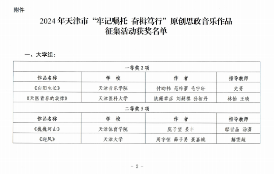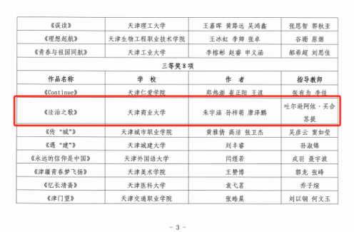 日前,市委教育工委、市教委公布了2024年天津市“牢记嘱托 奋楫笃行”原创思政音乐作品征集活动评奖结果,我校法学院2023级本科生朱宇涵、唐泽鹏、孙梓萌制作的音乐作品《法治之歌》荣获大学组三等奖,指导教师为法学院辅导员吐尔逊阿依·买合苏提。