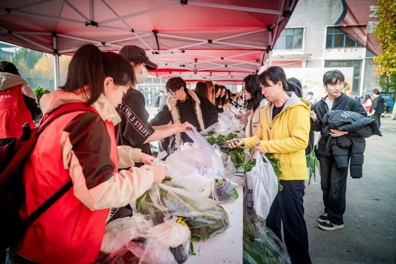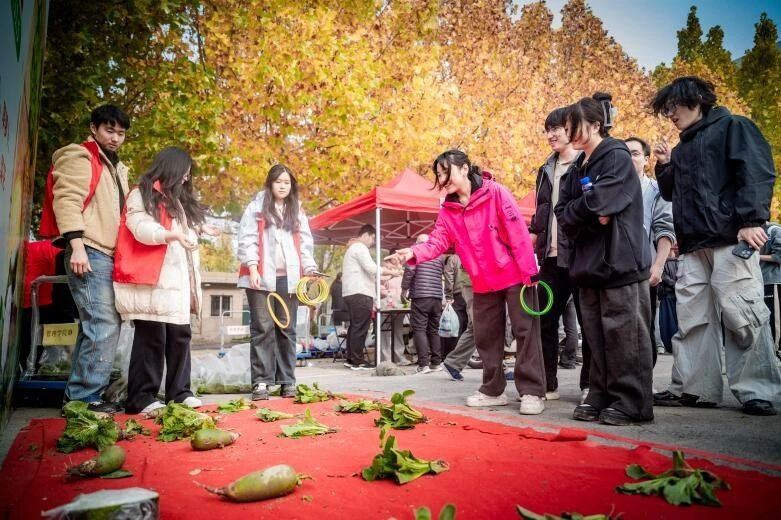 蔬菜集市售卖过程中,各学院同学在指定摊位化身“品牌主理人”,主动创新蔬菜营销策略,有些推出“买三送一”等组合优惠活动;有些组织小分队主动走出集市场地,向来往师生热情推介。现场人头攒动,气氛热烈。同步设置的“趣味套圈”互动环节,吸引大量师生参与,为活动增添了轻松愉快的氛围,进一步提升了活动的互动性与吸引力。