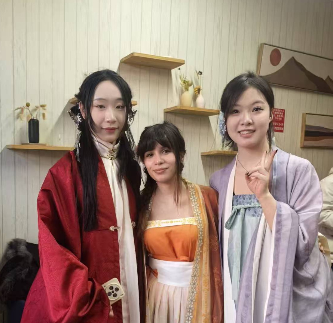 我校留学生们驻足于春联书写和汉服体验区,现场换装试穿,古典服饰与多元面孔相映成趣,成为现场一道独特的风景。更有热情洋溢的中外学生、对唱欢歌,将现场气氛推向高潮。