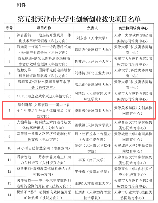 据悉,天津市大学生创新创业拔尖项目由市委教育工委、市教委设立,旨在培养和提高大学生创新、创意、创造、创业的意识和能力,助力高校就业创业教育、创业实践活动高质量发展,培育具有天津特色的高质量创新创业成果。本年度共有14个创新创业拔尖项目获批立项。