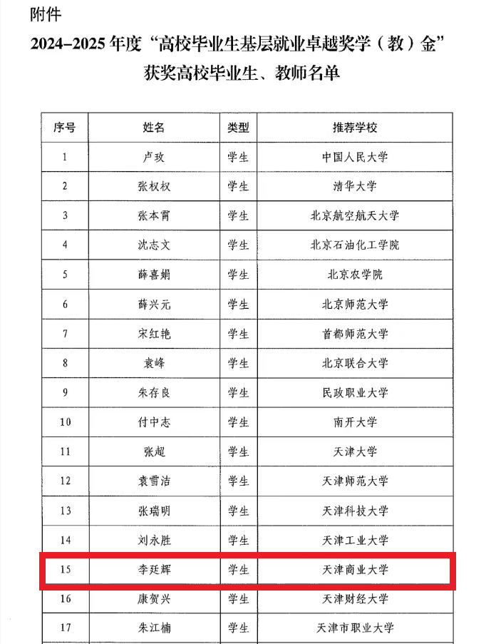近日,教育部高校学生司(高校毕业生就业服务司)转发了《关于公布2024—2025年度“高校毕业生基层就业卓越奖学(教)金”获奖人选的通知》,418名优秀高校毕业生获“高校毕业生基层就业卓越奖学金”,其中天津市8名,我校公共管理学院卓越会展师实验班2019届毕业生李廷辉获此殊荣。学校连续两年获此殊荣,2024年为我校2016届工业设计专业毕业生范国福。